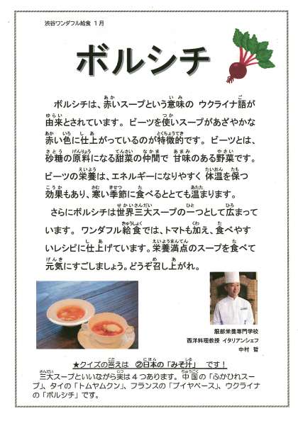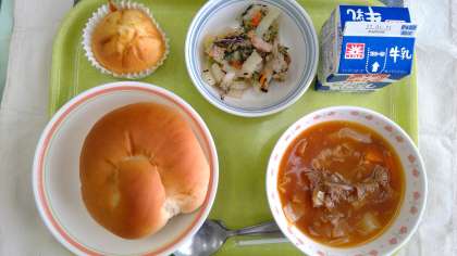 【今日の献立】1月25日(水)渋谷ワンダフル給食 公開日 2023/01/25 更新日 2023/01/25 今日の献立 今日の献立 ・ミルクパン ・ボルシチ ・白菜ゴマ酢サラダ ・カップケーキ ・牛乳