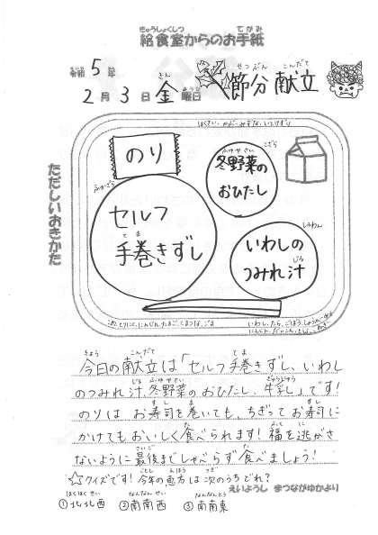今日の献立 ・セルフ手巻き寿司 ・いわしのつみれ汁 ・冬野菜のおひたし ・牛乳