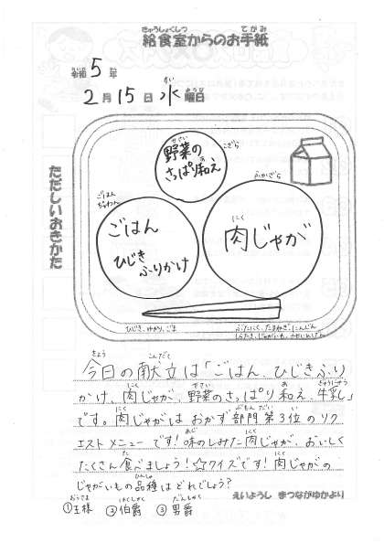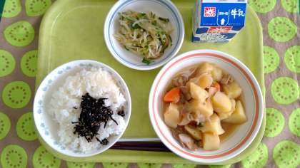 今日の献立 ・ごはん ・ひじきふりかけ ・肉じゃが ・野菜のさっぱり和え ・牛乳