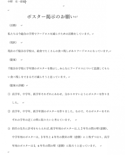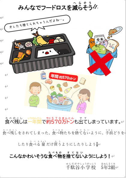 2月20日【5年生】さらにフードロス 公開日 2023/02/20 更新日 2023/02/20 校長日記 フードロスレシピの話を聴いた後、また、5年生が校長室に・・・ 今日はたくさん校長室に子供たちが来ます!!! 話を聴いてみると 「フードロスを全校で行っていくために、その啓発として、ポスターをつくりました。学校に掲示したい」とのこと とてもいいことです。どんどんやってください!!!!