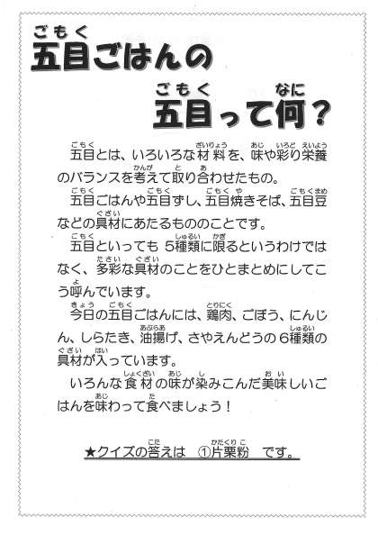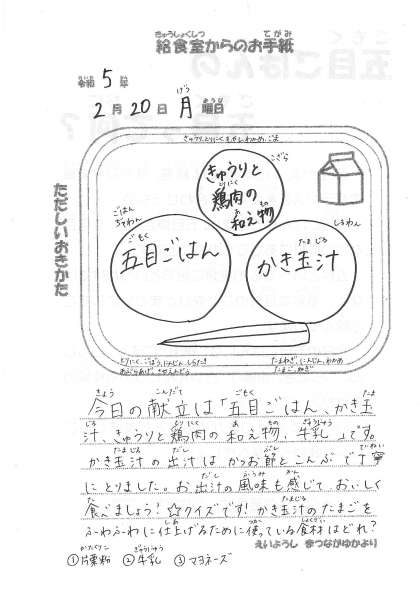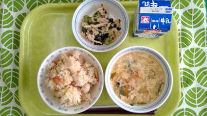今日の献立 ・五目ごはん ・かきたま汁 ・きゅうりと鶏肉の和え物 ・牛乳