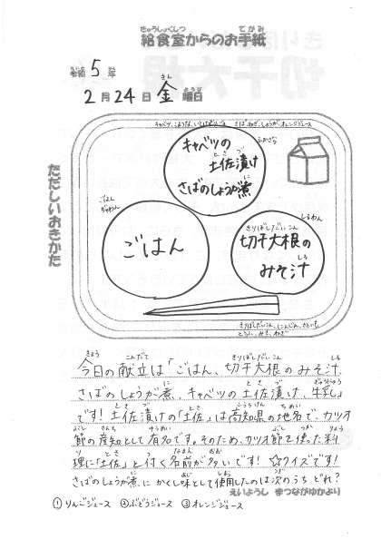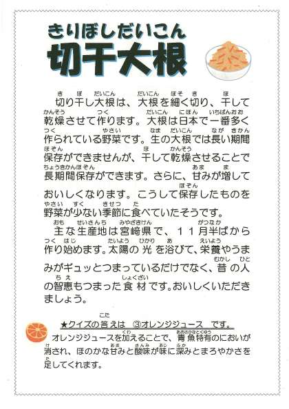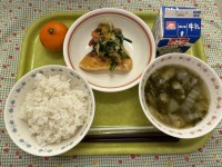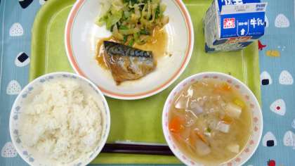 今日の献立 ・ごはん ・切干大根のみそ汁 ・さばのしょうが煮 ・野菜の土佐漬け ・牛乳