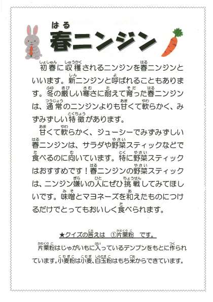 【今日の献立】3月7日(火) 公開日 2023/03/07 更新日 2023/03/07 今日の献立 今日の献立 ・ツナピラフ ・ABCスープ ・ポテト入りフレンチサラダ ・牛乳 今日は6年1組のお楽しみ給食を行いました。来週(14日)の6年2組のお楽しみ給食の日に合わせて報告したいと思います。