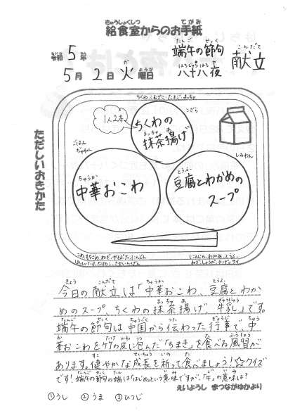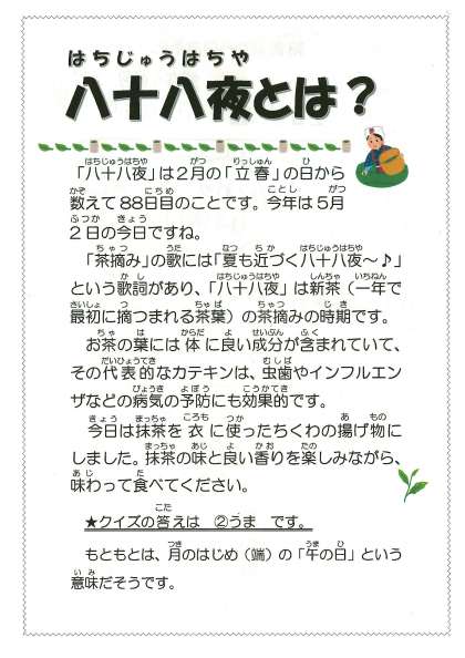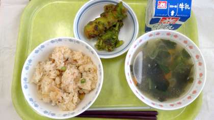 【今日の献立】5月2日(火) 端午の節句・八十八夜献立 公開日 2023/05/02 更新日 2023/05/02 今日の献立 今日の献立 ・中華おこわ ・豆腐とわかめのスープ ・ちくわの抹茶揚げ ・牛乳