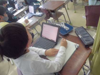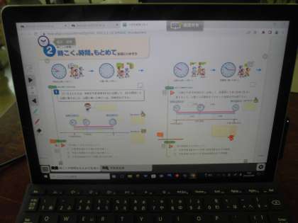 5月8日【3年生】時刻と時間 公開日 2023/05/08 更新日 2023/05/08 校長日記 子供たちの机上には、タブレット ノート 筆箱 場合によっては、紙の教科書が並んでいます。 近くの子供たちと話し合いをしながら、授業が進みます。 タブレットの練習問題を解きながら、理解の定着を図ります!!