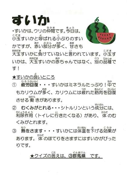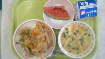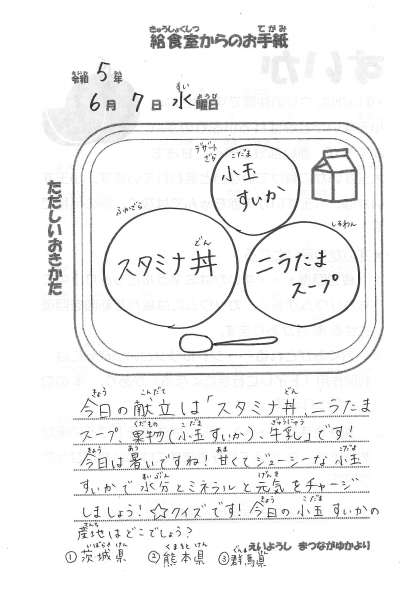 今日の献立 ・スタミナ丼 ・ニラたまスープ ・果物(小玉スイカ) ・牛乳