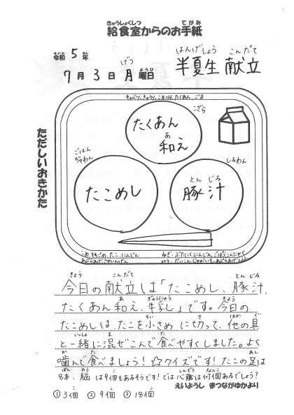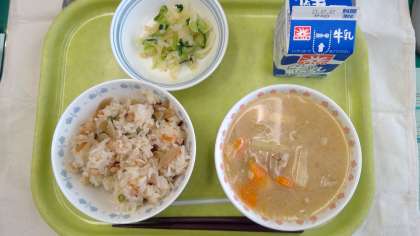 今日の献立 ・たこめし ・豚汁 ・たくあん和え ・牛乳
