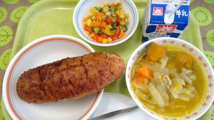 今日の献立 ・ココア揚げパン ・夏野菜のスープ煮 ・トロピカルサラダ ・牛乳