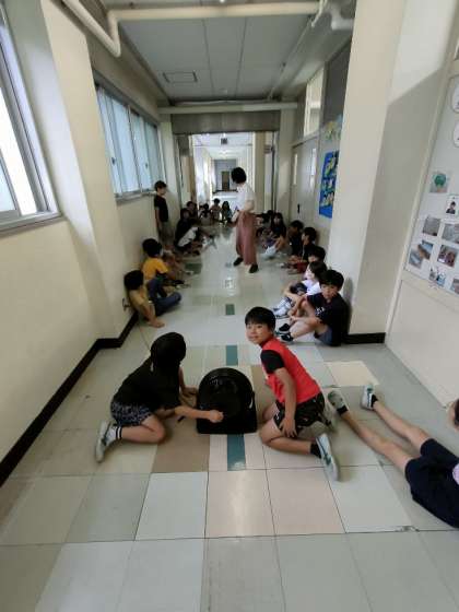 しばらくして 廊下を通ると、 実験のまとめを廊下で!!