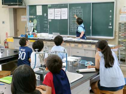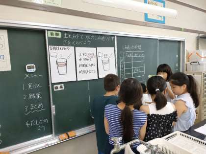 7月13日【4年生】理科室での実験! 公開日 2023/07/13 更新日 2023/07/13 校長日記 4年生は、理科室での授業です! 土と砂 水を通すとき 水がそれらを通過するスピードの違いを確かめていました。 各班で実験を行い、実験結果をそれぞれの班が黒板に記入します ビーカーを使って 実際に水を通してみます!! どんな発見があったのでしょう!!