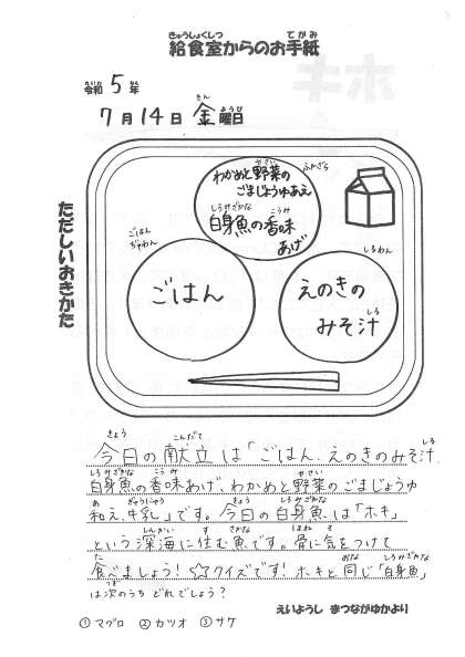 【今日の献立】7月14日(金) 公開日 2023/07/14 更新日 2023/07/14 今日の献立 今日の献立 ・ごはん ・えのきのみそ汁 ・白身魚の香味揚げ ・わかめと野菜のごまじょうゆ和え ・牛乳