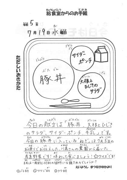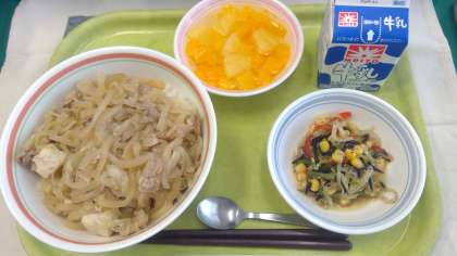 今日の献立 ・豚丼 ・大根とひじきのサラダ ・サイダーポンチ ・牛乳