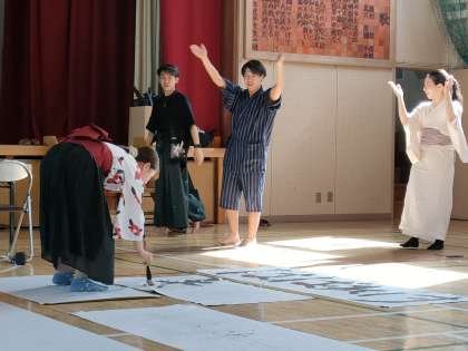 9月24日 圧巻 書道 パフォーマンス 公開日 2023/09/24 更新日 2023/09/24 校長日記 書家の 市川 雄太さんをはじめとするグループの皆さんによるパフォーマンス リズムに合わせて 書を書きます!!