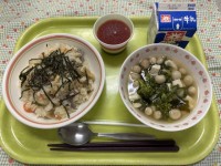 今日の献立 ・五目うどん ・たくあん和え ・黒ごま大学芋 ・牛乳