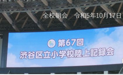 今日の全校朝会は、先週開催された 渋谷区立小学校 陸上記録会の様子を伝えました。