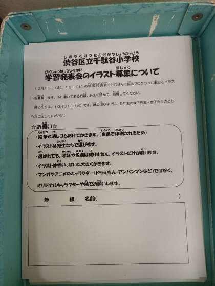 10月16日【全校朝会】学習発表会のイラスト募集します!! 公開日 2023/10/16 更新日 2023/10/16 校長日記 全校朝会では、学習発表会のプログラム用のイラスト募集のお話もありました。 皆さんのご応募待っています。 校長室前に横暴用紙がありますので、 どんどん応募願います。 10月31日までです!! 皆さんの力作 期待しています。