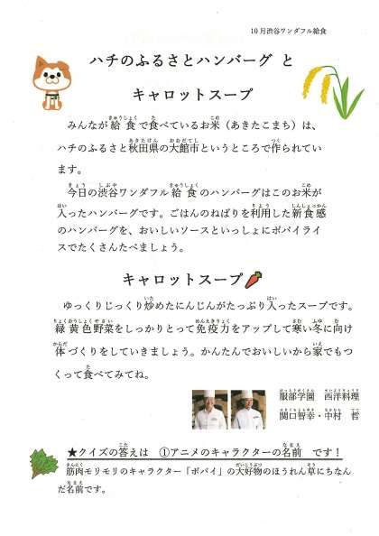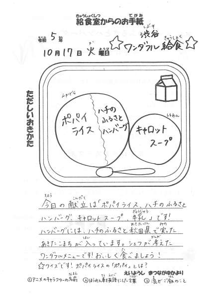 【今日の献立】10月17日(火)渋谷ワンダフル給食 公開日 2023/10/17 更新日 2023/10/17 今日の献立 今日の献立 ・ポパイライス ・ハチのふるさとハンバーグ ・キャロットスープ ・牛乳