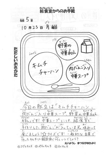 今日の献立 ・キムチチャーハン ・肉団子入り中華スープ ・野菜の中華和え ・牛乳