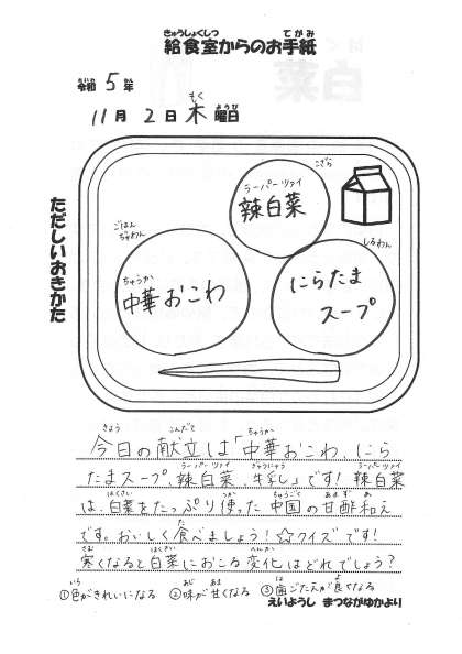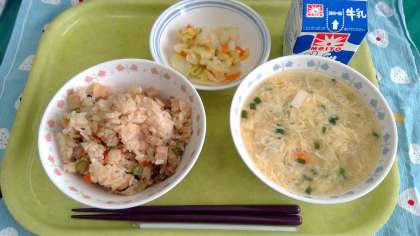 今日の献立 ・中華おこわ ・ニラたまスープ ・辣白菜 ・牛乳