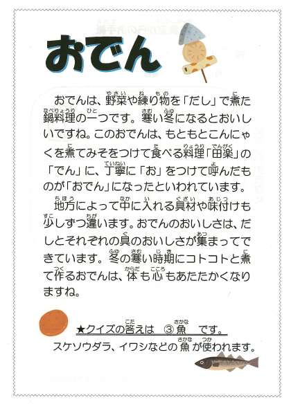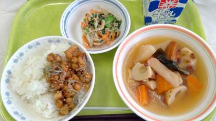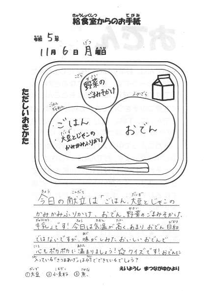 今日の献立 ・ごはん ・大豆とじゃこのかみかみふりかけ ・おでん ・野菜のごまみそ和え ・牛乳