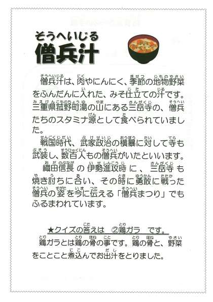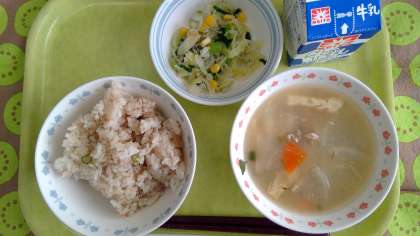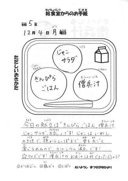 今日の献立 ・きんぴらごはん ・僧兵汁 ・じゃこサラダ ・牛乳