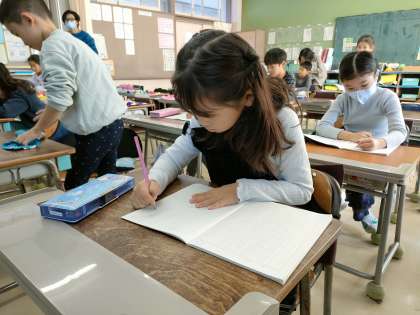 1月24日【1年生】国語の授業 公開日 2024/01/24 更新日 2024/01/24 校長日記 1年生の教室にいくと国語の授業をしていました。 最初は漢字の学習です。 しっかり正しくかけるようになることが大切です。 電子黒板で書き順などを押さえ、そして、ノートにしっかり書く練習 タブレットは使うようになっても、文字をしっかり書くことも大切です