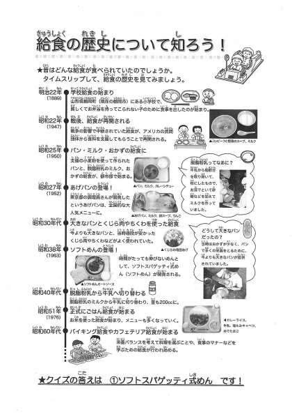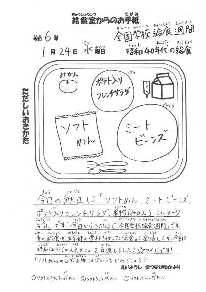 【今日の献立】1月24日(水) 公開日 2024/01/24 更新日 2024/01/24 今日の献立 今日の献立 ・ソフトめん ・ミートビーンズ ・ポテト入りフレンチサラダ ・果物(みかん) ・ミルメーク ・牛乳 1月24日〜1月30日は「全国学校給食週間」です。 ※学級閉鎖のクラスは来週水曜日にミルメークを提供します。