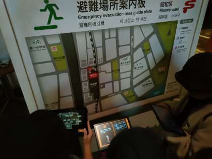 突然 建物が崩壊しているエリアに遭遇した子供たち タブレットを使いながら学習を進めます