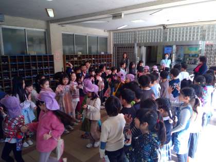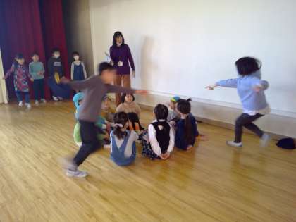 2月8日【1年生】保育園児と交流会3 公開日 2024/02/08 更新日 2024/02/08 校長日記 なかよし園と美希保育園のお友達をお迎えして交流会をしました。 まあーるく輪になってもらって、その周りを走って、誰の後ろに帽子を落としたか、うまく当てられるかな? 最後は玄関でみんなでお見送り。