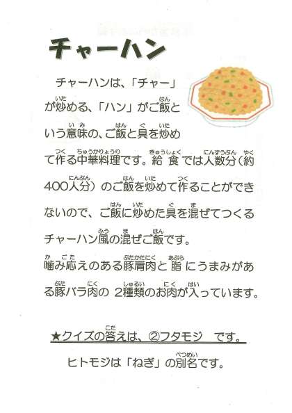 今日の献立 ・チャーハン ・ニラと豆腐のスープ ・パリパリサラダ ・牛乳