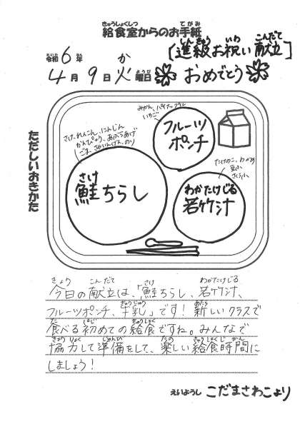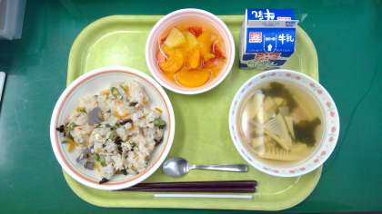 【今日の献立】 ・鮭ちらし ・若竹汁 ・フルーツポンチ ・牛乳
