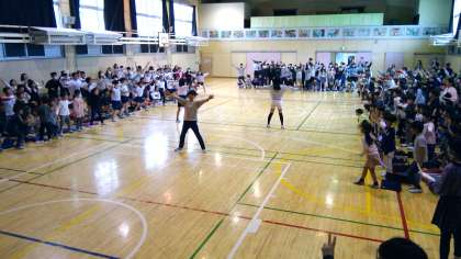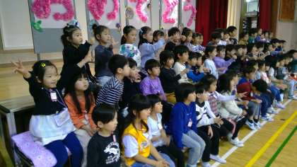 1年生を在校生全員でお迎えしました。 千小じゃんけん グー・チョキ・パー で全員でじゃんけん