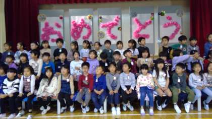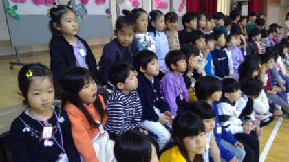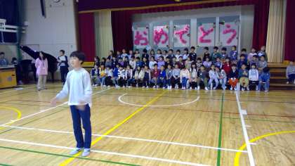 1年生を在校生全員でお迎えしました。 校歌斉唱。