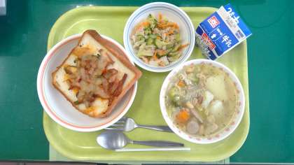【今日の献立】 ・ピザトースト ・ポトフ ・ツナサラダ ・牛乳