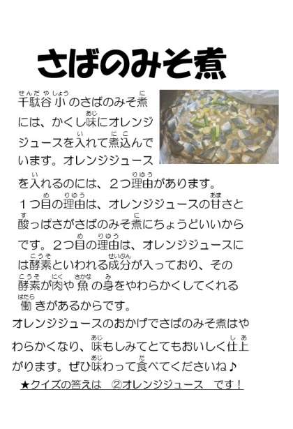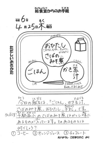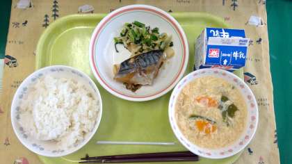 【今日の献立】 ・ごはん ・かき玉汁 ・さばのみそ煮 ・おひたし ・牛乳