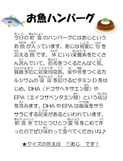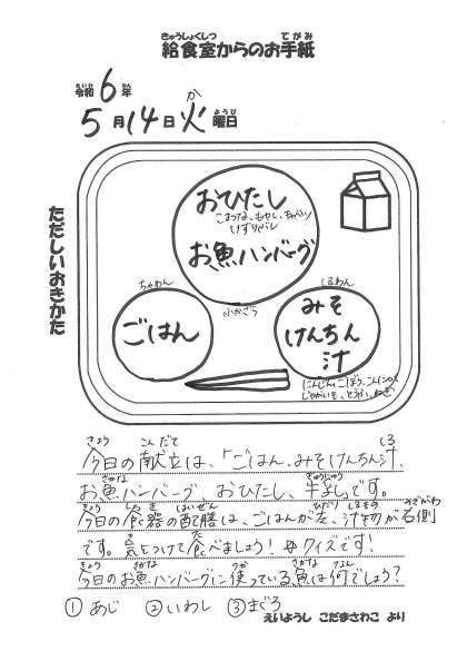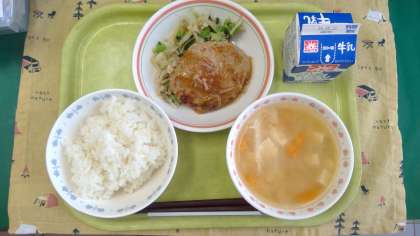 【今日の献立】 ・ごはん ・みそけんちん汁 ・お魚ハンバーグ ・おひたし ・牛乳
