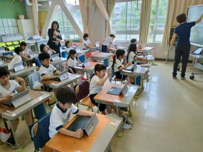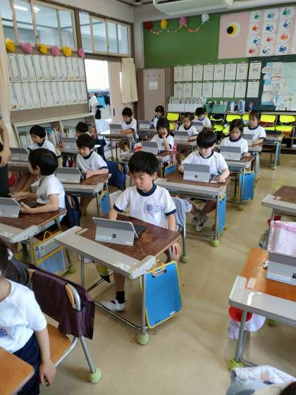 5月22日【1年生】国語 文を作ろう 公開日 2024/05/22 更新日 2024/05/22 校長日記 ひらがなを2文字 学習した後 文を作る 学習に移りました。 残り15分で タブレットを活用しての文づくりです
