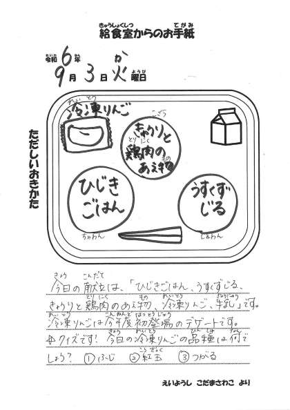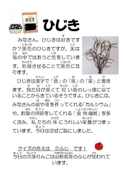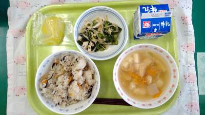 【今日の献立】 ・ひじきごはん ・うすくず汁 ・きゅうりと鶏肉の和え物 ・牛乳