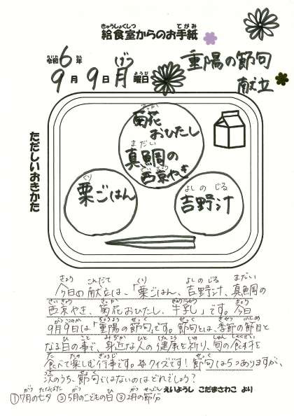 【今日の献立】 ・栗ご飯 ・吉野汁 ・真鯛の西京焼き ・菊花おひたし ・牛乳