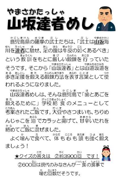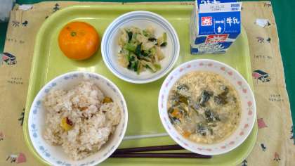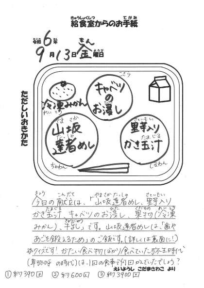 【今日の献立】9月13日(金) 公開日 2024/09/13 更新日 2024/09/13 今日の献立 【今日の献立】 ・山坂達者めし ・里芋入りかき玉汁 ・キャベツのおひたし ・果物(冷凍みかん) ・牛乳