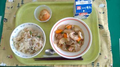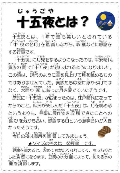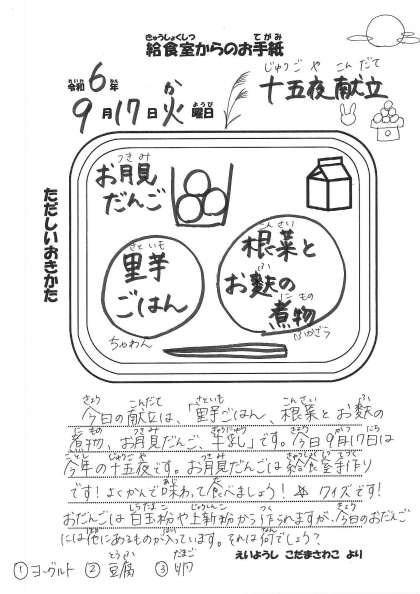 【今日の献立】 ・里芋ごはん ・根菜とお麩の煮物 ・お月見団子 ・牛乳