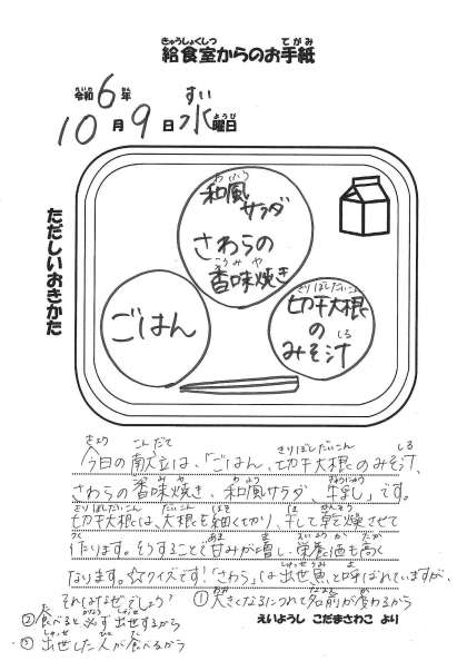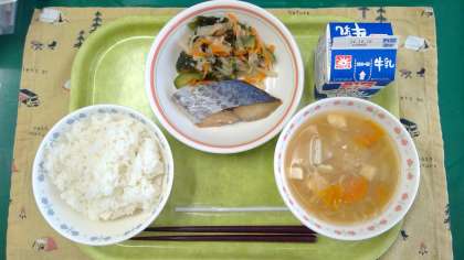 【今日の献立】 ・ごはん ・切干大根のみそ汁 ・さわらの香味焼き ・和風サラダ ・牛乳