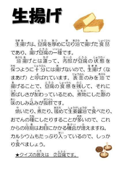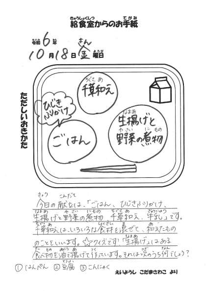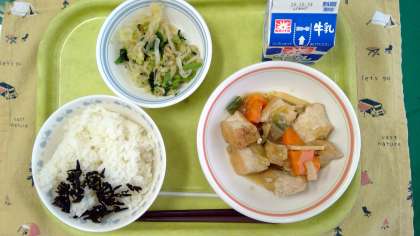 【今日の献立】 ・ごはん ・ひじきふりかけ ・生揚げと野菜の煮物 ・千草和え ・牛乳