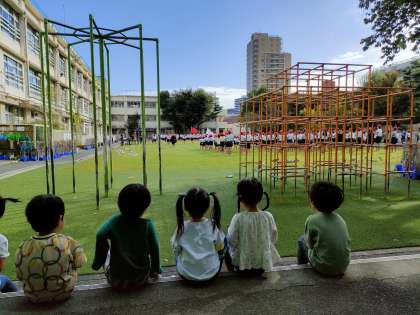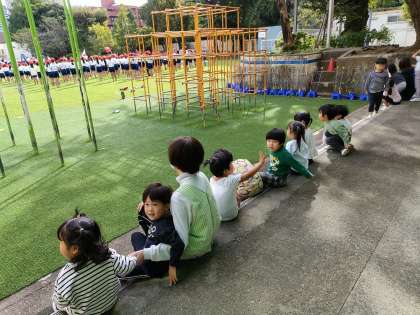 迫力ある 小学生の応援の声を聴いて なかよし園の大勢の子供たちが 校庭に出てきました!!
