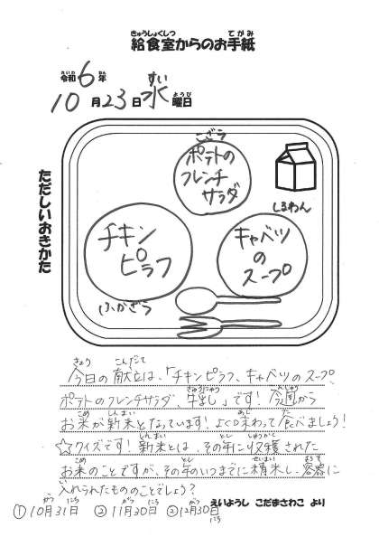 【今日の献立】 ・チキンピラフ ・キャベツのスープ ・ポテトのフレンチサラダ ・牛乳