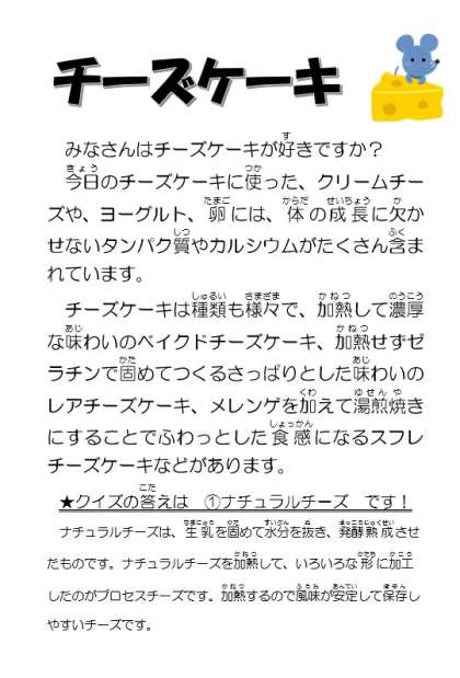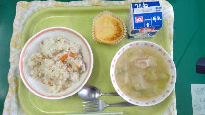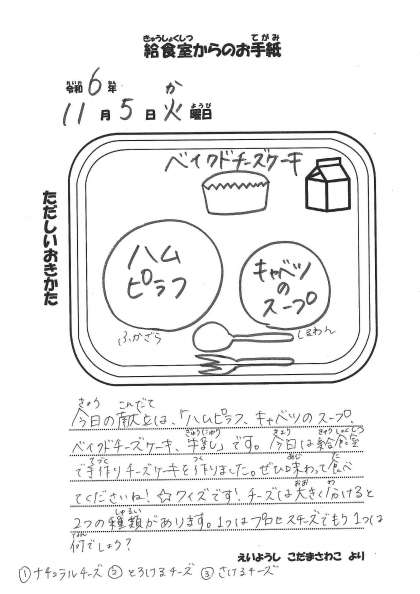 【今日の献立】 ・ハムピラフ ・キャベツのスープ ・ベイクドチーズケーキ ・牛乳