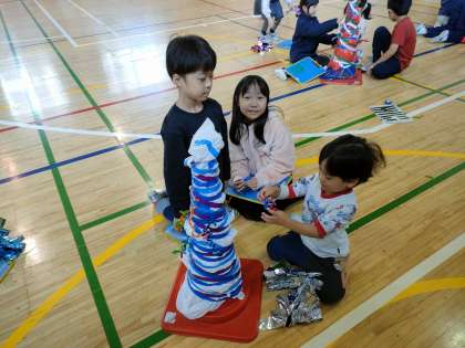 3年生がサポートしながら なかよし園の子供たちが楽しそうに模様を作っています