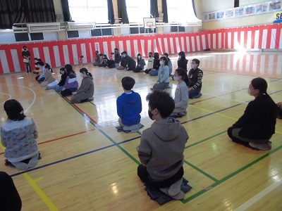 【校長日記】3月18日(木)狂言教室 公開日 2021/03/18 更新日 2021/03/18 校長日記 6年生の狂言教室。万作の会の皆さんの「附子」を鑑賞してから、所作などのワークショップ。緊張しながらも本物に触れる貴重な体験ができました。午前中にはなかよし園の修了式(卒園式)がありました。
