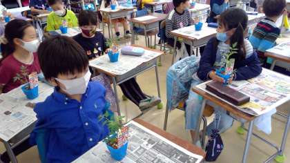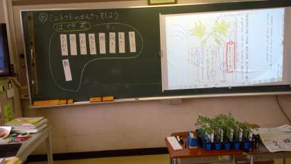 2年生の生活科では、全員がミニトマトを、そして、ピーマン、トマト、ナス、キュウリ、サツマイモ、オクラ、枝豆の中から好きな野菜を一つ選び育てます。1年生で育てたアサガオの経験を活かし、それぞれの野菜の特徴をとらえます。同時期に国語科では、観察の視点と記録の仕方を学習します。国語科で学んだことを生活科に活かします。活動重視の生活科では、このように体験したことを表現活動につなげることで、思考力・判断力・表現力の育成を図ります。また、この体験が3年生以降の理科の学習につながっていきます。