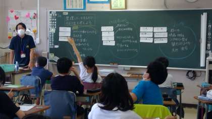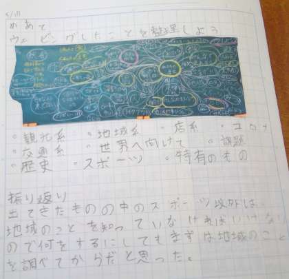 課題設定の場面。千駄ヶ谷の町をどうしていきたいか、各自が出した意見を項目ごとにまとめ、今後の方向性を考えました。振り返りの記述から、課題設定するに当たり、千駄ケ谷地域の現状を把握する必要があると児童が思っていることが分かります。このような声を拾って、千駄ケ谷の地域のことを詳しく調べるということにつなげていきます。前回の板書をコピーして、前時の学びを想起させる工夫もいいなと思いました。